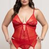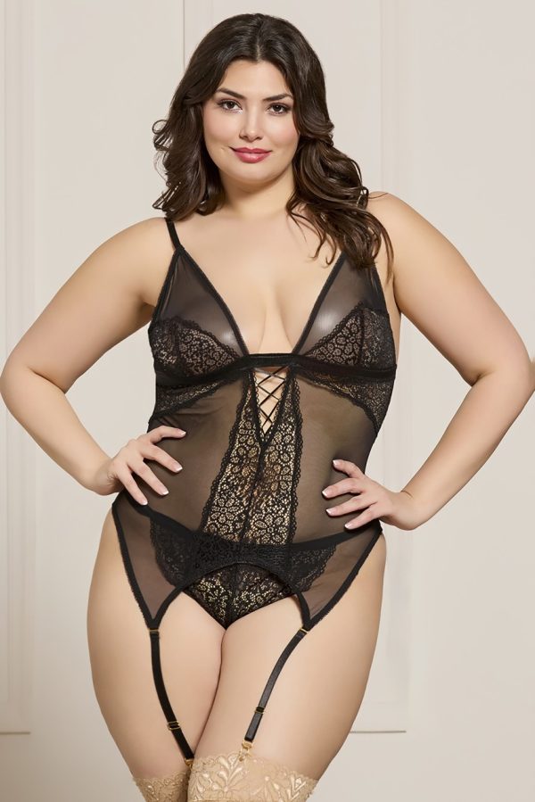 Two piece cami set. Lace and mesh cami with adjustable straps, gold hardware, removable garters, and strappy g-string