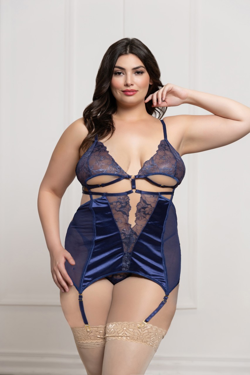 Two piece chemise set. Satin, lace, and mesh chemise with triangle cups, strappy elastic detail, adjustable straps, gold hardware, removable straps, and panty