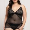 Two piece chemise set. Lace and mesh chemise with side ribbon lace-up, attached side garters, gold hardware, and g-string