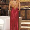 Stunning long gown with lace trimmed cups low back with criss cross tie shoulder straps that tie down to a flowing train of scalloped lace and charmeuse. Available in black electric blue red white. Also available in Plus Sizes. (Front image shown in black for illustrative purposes)