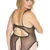 Stretch Lace and 15 Denier Open Bust Teddy with convenient crotch opening. Colors: Black Plum Red Hot Pink. Sizes: 1/2X 3/4X. XX2497 Size: 5/6X.