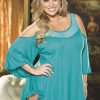 Fabulously comfortable and so versatile that you can wear it with the deep “V” in the front or back! Sheer Net and Dyed to Match Lace adorn the top and sexy handkerchief hemline. Exposed shoulders beg to be caressed and kissed. Comes with matching G-string. Available in black magenta teal and sapphire.