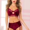 Two piece bra set. Velvet, floral galloon lace, and mesh long line bra with underwire lightly padded cups, satin ribbon tuxedo bows, keyhole details, cage detail, gold hardware, adjustable picot elastic straps, hook and eye closure, and high waist panty with removable garters