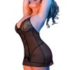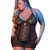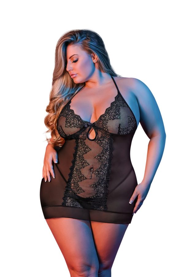 From the Exposed by Magic Silk collection, this style includes: A chemise featuring plush halter ties that wrap around the neck for closure, soft lace cups, keyhole cutout accent in front, a ruffle mesh hem, and a classic mesh G-string. Soft, black stretch mesh complemented with lace details. Hand wash, cold. No Bleach. Dry flat.