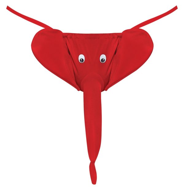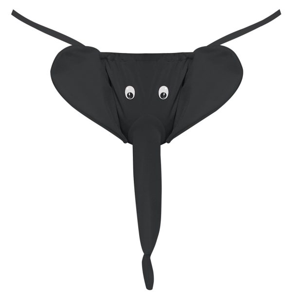 Novelty Squeaker Elephant g-string features googly eyes and elephant ears in front, pouch with elongated elephant truck shaft and functional squeaker, g-string back and elastic waistband.