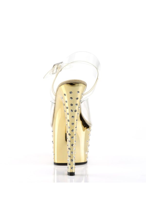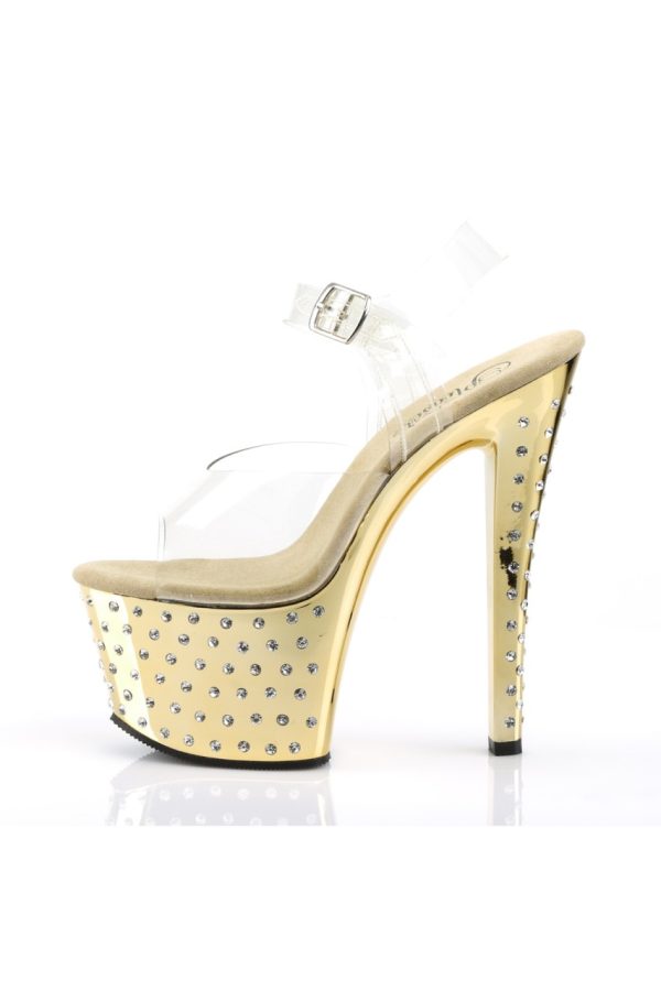 7″” (17.8cm) Heel, 2 3/4″” (7cm) Platform Ankle Strap Sandal Featuring Rhinestone Studded Chrome Bottom