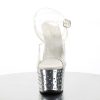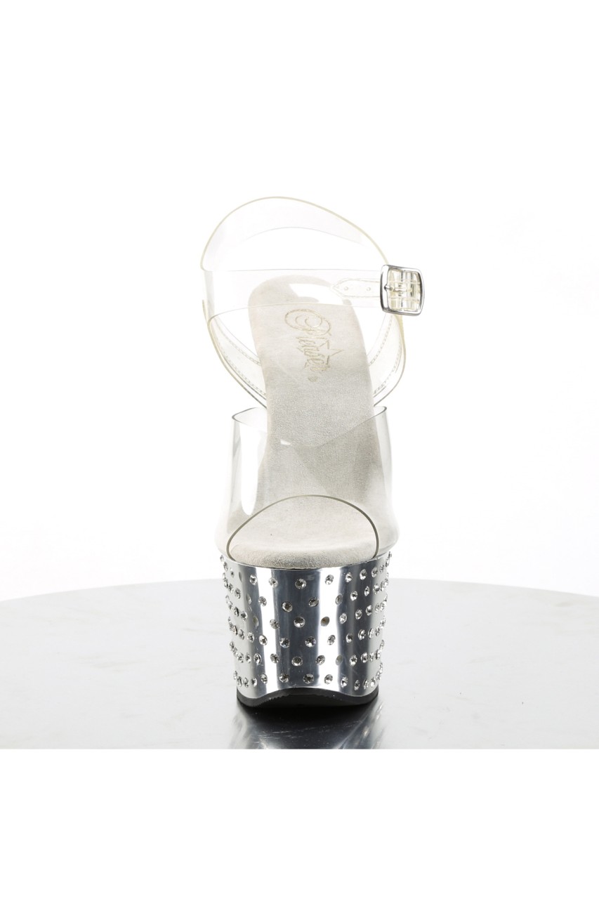 7″” (17.8cm) Heel, 2 3/4″” (7cm) Platform Ankle Strap Sandal Featuring Rhinestone Studded Chrome Bottom