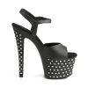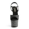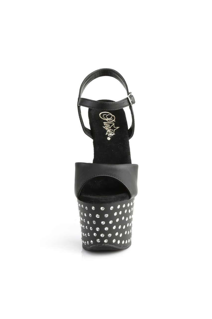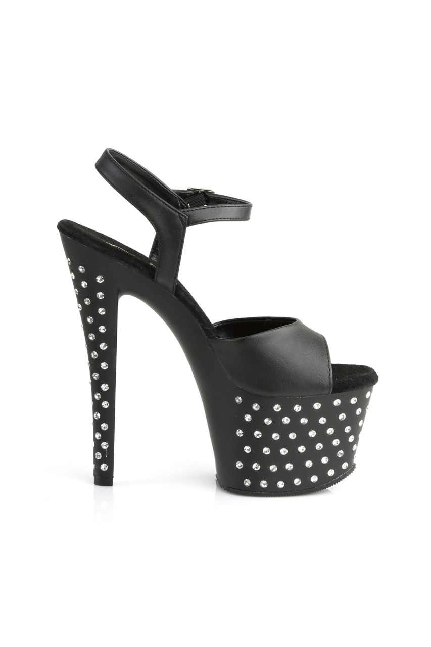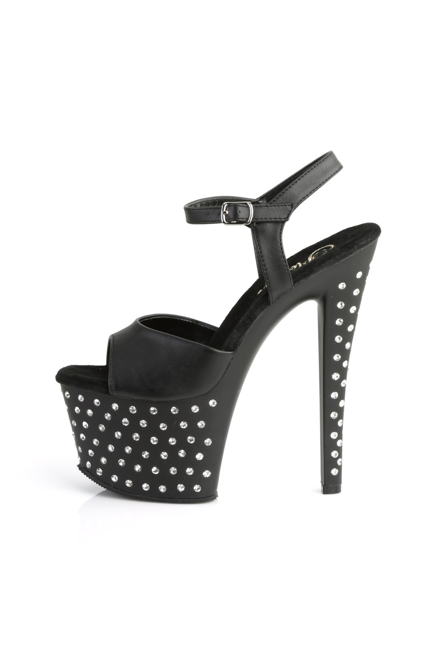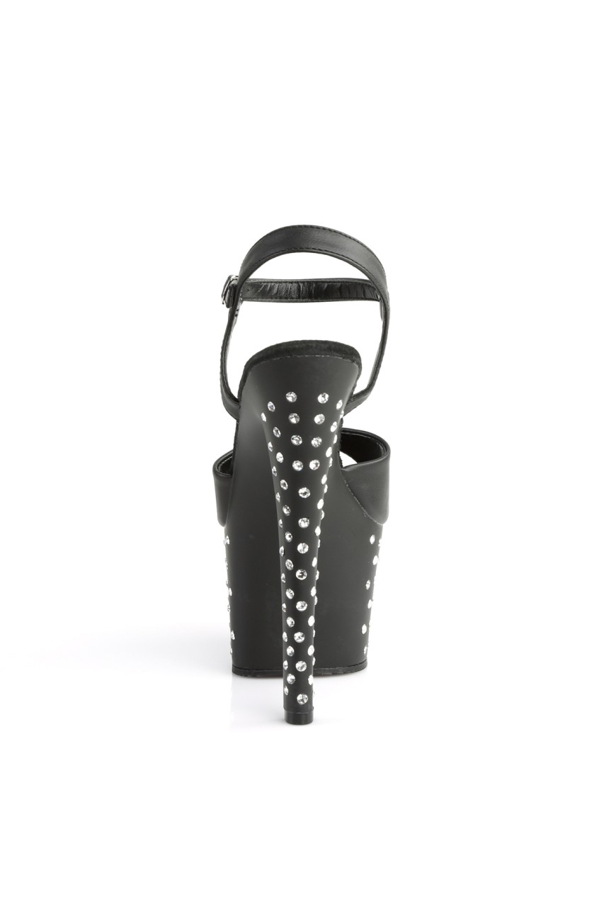 7″” (17.8cm) Heel, 2 3/4″” (7cm) Chrome Plated Platform Ankle Strap Sandal Featuring Rhinestones Studded on Platform