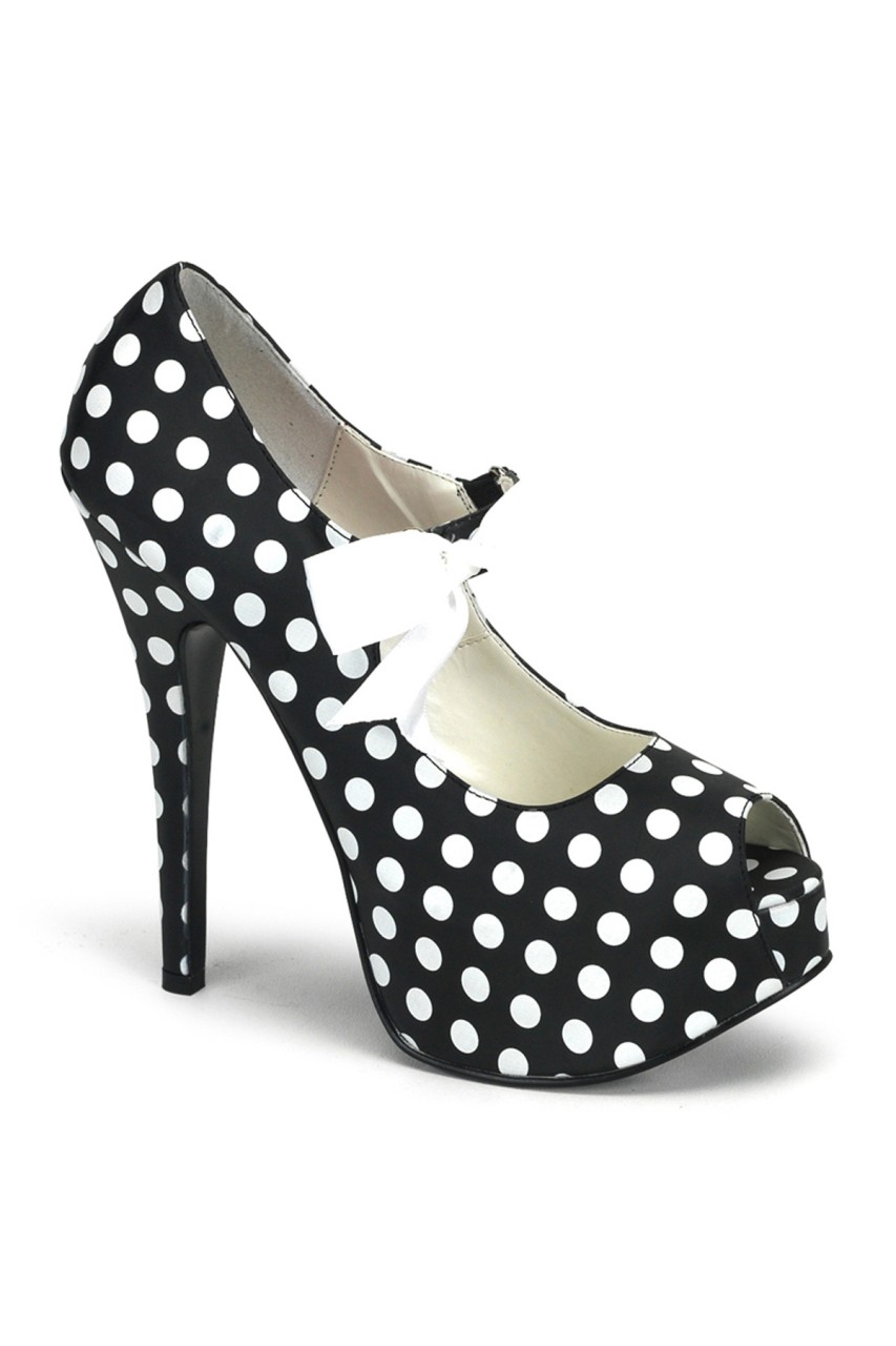 5 3/4″” (14.6cm) Heel, 1 3/4″” (4.5cm) Concealed Platform, Satin Polka Dots with Matching Satin Bow, Peep Toe Pump