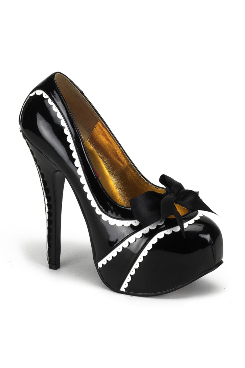 5 3/4″” (14.6cm) Heel, 1 3/4″” (4.5cm) Concealed Platform, Patent Upper with White Scalloped Trim and Matching Satin Bow Pump
