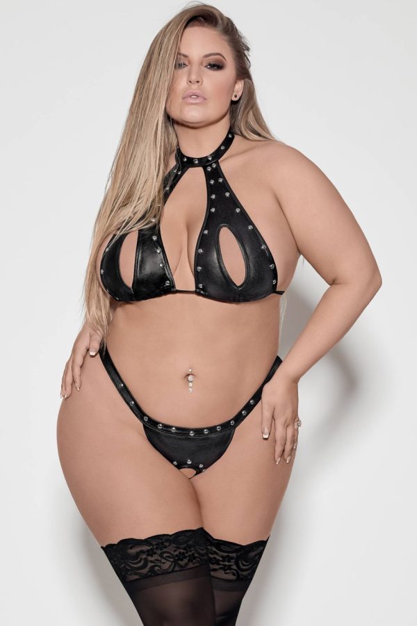 A choker peek-a-boo bra featuring velcro collar and tie in back, and a matching crotchless thong.