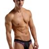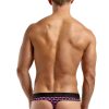 Low rise thong, solid pouch combined with two toned printed fabric, tone on tone branded plush elastic waistband.