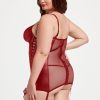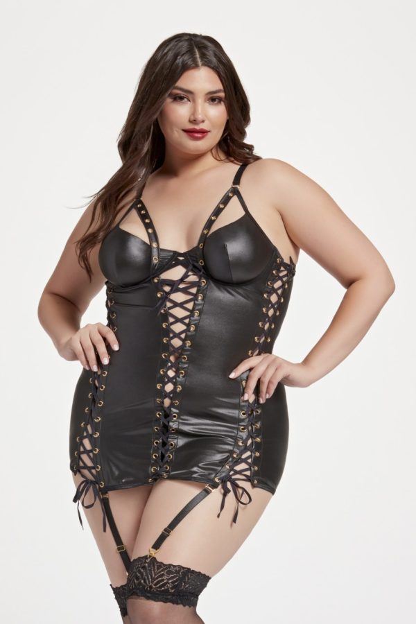 Vegan leather lace up chemise with grommets along center front and princess seams and fishnet back, plus adjustable garter straps. Balconette style bra cup, all gold hardware and matching color vegan leather g-string