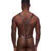 Warrior features one piece thong with contour pouch, decorative studs, cire waistband with rings, attached X style criss cross harness with center ring in front and Y style harness with ring connection affixed to the micro thong back.