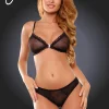 Elegant corset style top and thong set in stretchy silvery material and edged with black lace embroidery and ruffles. Top and thong are finished off with bow and sparkling diamante detail.