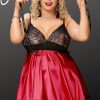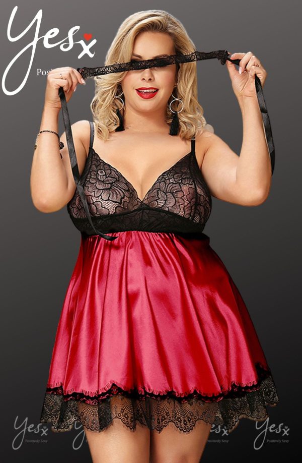 Beautiful flowing red satin babydoll with black lace cups. The straps are adjustable and the hem is edged with deep eyelash lace. Matching lace blindfold is included. This item arrives packaged in a Yesx satin bag.