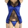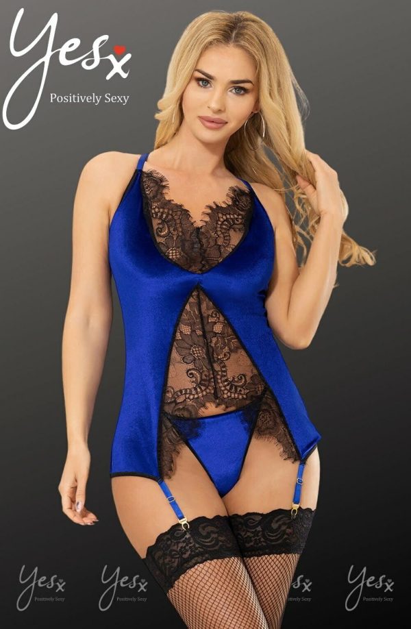 Dress in luxury with our Rich Blue Gartered Babydoll set (thong included), adorned in shimmering fabric and delicate eyelash lace. The open front and strappy back add a hint of seduction to its elegant design. With attached garters, this babydoll is a perfect blend of sophistication and allure, perfect for elevating your intimate moments in captivating blue (stockings not included)
