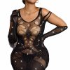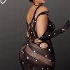 Celebrate your curves in style with this Black Plus Size Bodystocking Dress featuring shimmering detail. The chic design enhances and flatters your figure, while the intricate body stocking pattern adds a touch of allure. The shimmering detail brings a glamorous element, ensuring you stand out at any intimate occasion or night on the town. Embrace your confidence and showcase your sophistication with this stunning plus-size black bodystocking dress (gloves and thong are not included)