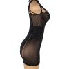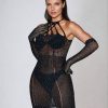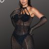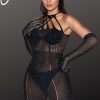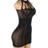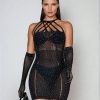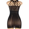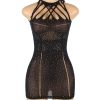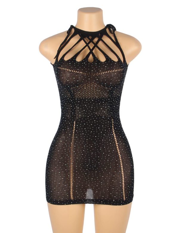 Get ready to dazzle in this ultra-glam sheer black dress, sprinkled with shimmering rhinestones for that perfect sparkle! This eye-catching dress features a striking halter neckline with sexy cut-out details that add a playful edge to your look. Designed to show off your figure, the fishnet fabric hugs every curve, while the rhinestones catch the light and make sure all eyes are on you. Ideal for nights when you want to shine, this dress is a statement piece on its own—just add your favourite lingerie underneath. (Please note: bra, briefs, and gloves are not included.) Embrace your inner diva and make every night unforgettable!