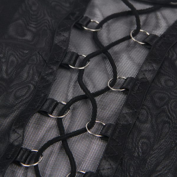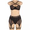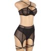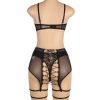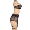 Designed to embrace and flatter all curves, this plus-size three-piece set is the perfect blend of elegance and allure. The black mesh bra features soft, breathable fabric providing a comfortable yet seductive fit. The matching garter belt is designed with a lace-up back for an adjustable, personalised fit, while the thong completes the look. To add a daring touch, the set includes leg rings that elevate the ensemble, offering a bold, confident style for those who love to feel both sexy and sophisticated.