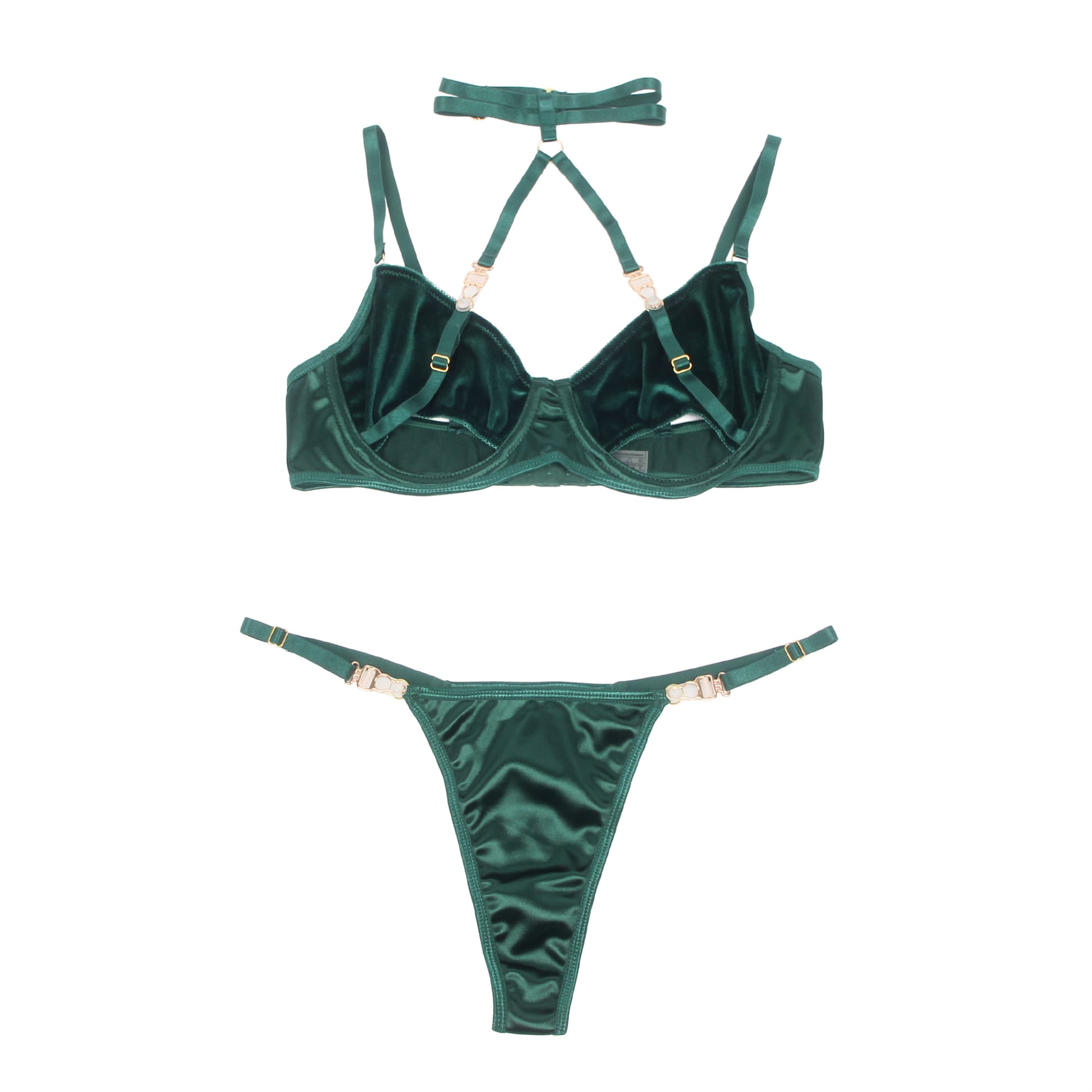 A gorgeous halter bra set, designed to celebrate every curve and crafted with a velvety feel that’s irresistible to the touch! Featuring a bold, hollow-cut bra with supportive underwire and a seductive halter neckline, this set brings confidence and style together effortlessly. The ultra-soft, velvety fabric feels amazing against the skin, while gold hardware adds a touch of glamour. Paired with a high-cut thong that accentuates your curves, this set is perfect for making a statement. Embrace your inner vixen and revel in the plush allure of this stunning lingerie set!
