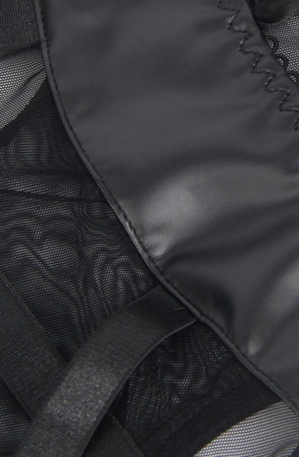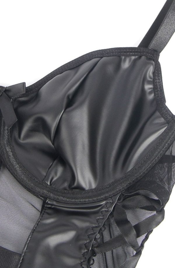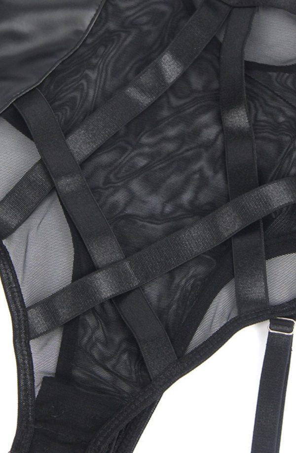 Black Faux Leather Look & Mesh Bodysuit with Garter Straps This striking black bodysuit combines bold faux leather panels with delicate sheer mesh for a daring yet sophisticated look. Featuring a structured underwire bust, side lace-up detailing, and adjustable shoulder straps for the perfect fit. This piece isn’t just lingerie; it’s an experience designed to make you feel absolutely captivating. The corset-inspired side lacing allows you to customize the fit to your body, accentuating your silhouette in all the right places. Whether worn for a special evening with someone special or simply as a celebration of your own sensuality, this bodysuit promises to make you feel like your most confident, empowered self. The elegant design includes: Premium faux leather material with a high-shine finish Strategic mesh panels creating visual interest and texture contrast Corset-inspired side lacing for an adjustable fit and edgy aesthetic Detachable garter straps for versatile styling options Hook-and-eye back closure for easy wear