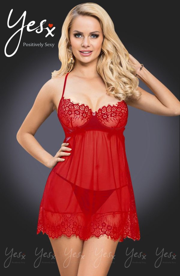 A seductive babydoll and with elegant eyelet lace and ribbon bows. This babydoll arrives with a thong and features underwired cups and adjustable straps with hook and eye back fastening. This item arrives packaged in a YesX satin bag.