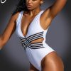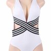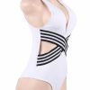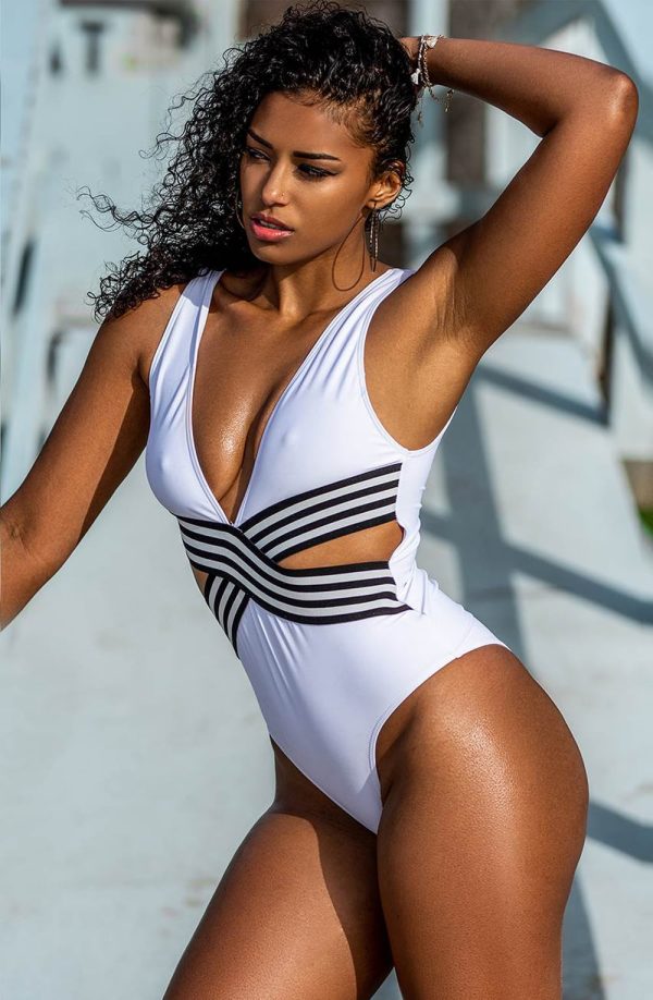 Classic and sexy white swimsuit that features a plunging neck and striking black design with cut out panels. This figure flattering swimsuit includes removable pads. This item arrives packaged in a YesX satin bag.