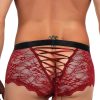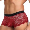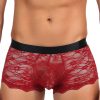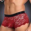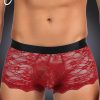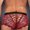 Seductive red sheer floral lace men’s boxer brief with black satin like finish waist band. Featuring decorative criss-cross tie detailing at the back of the briefs.