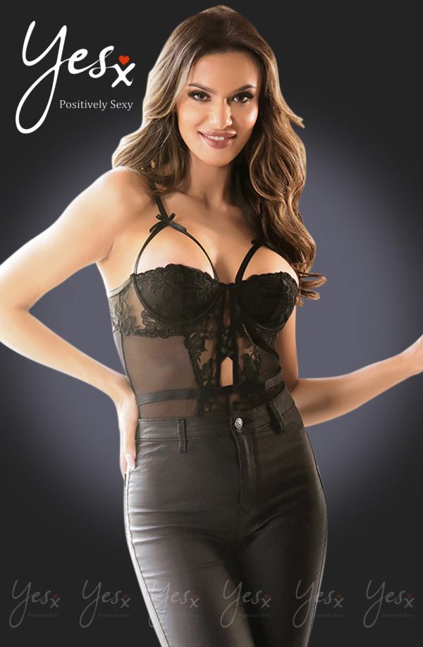Stunning mesh body suit with elegant lace detailing and pretty bows. Make this gorgeous bodysuit your perfect evening look by pairing it with either your favourite jeans or hold ups. This item arrives packaged in a YesX satin bag.