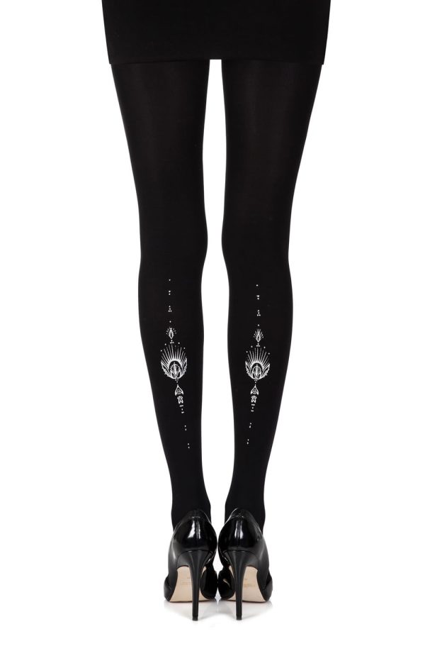 Opaque black 120 denier tights with silver Indian ethnic jewel print along the lower legs. The print is on both legs and can be worn either at the front or at the back part of the legs.