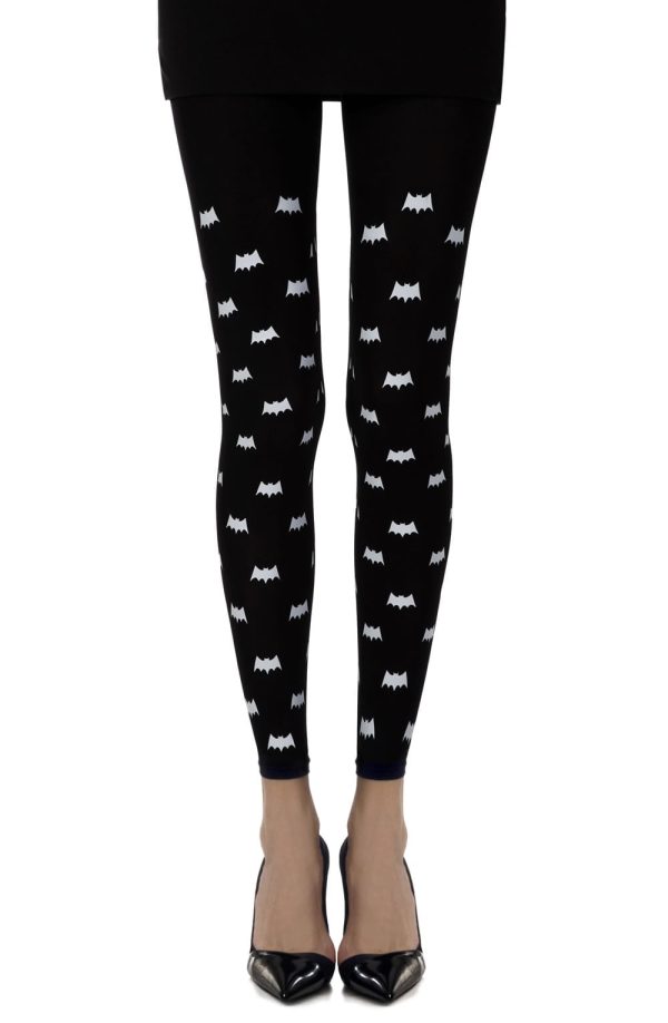 Opaque 120 denier footless black tights with a special little gray light bats print all over the legs. The print is on both legs front and back.