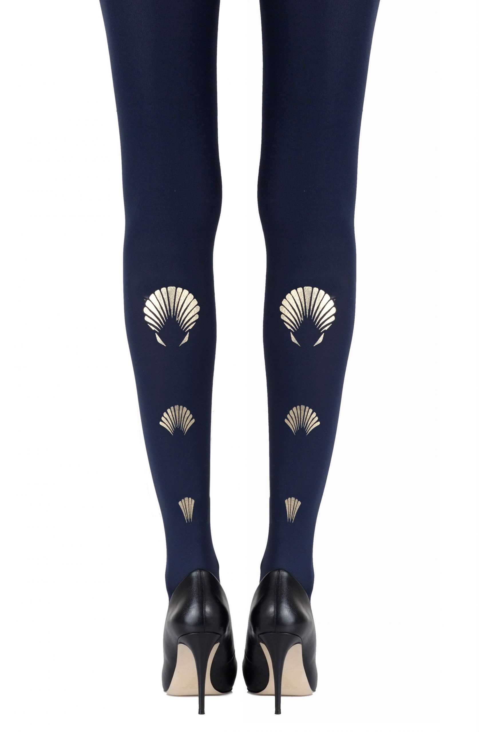Go full on mermaid with What The Shell tights that feature two-sided prints of shell graphics. Colour: Navy tights with Gold print. Thickness: 120 denier. No doubt you will shine with our metallic prints. Please note that these prints require extra care when washing and will naturally fade with wear. Unless they have X-ray vision no one will be able to see through these opaque tights. Is the party in the front or the back? You choose with reversible tights where to place all the fun. Hand print no two are the same.